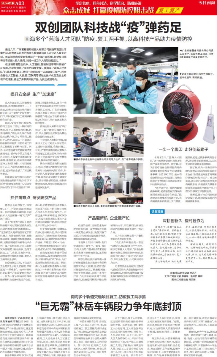 在這場疫情阻擊戰中,人工智能、智能制造等高科技被廣泛應用,為防控提供了強大的科技支撐。在南海,“藍海人才團隊”已基本全面復工,他們一邊抓防疫一邊加緊復工復產,利用自身在人工智能、大數據、互聯網等領域的技術優勢及自主知識產權成果,推出了多款高科技產品,為抗擊疫情助力。